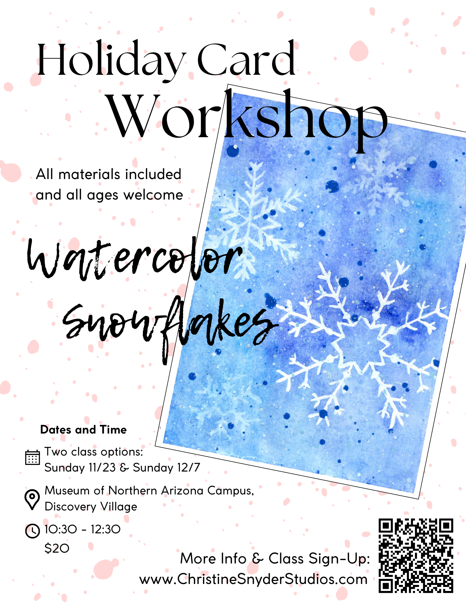 Make your own beautiful snowflake watercolor card to gift this holiday season. We will take inspiration from real snowflake images and use fun watercolor techniques to layer on color creating a sense of depth. In this workshop, you will not be copying an example, but instead creating a piece unique to you with different snowflake shapes and colors you choose.